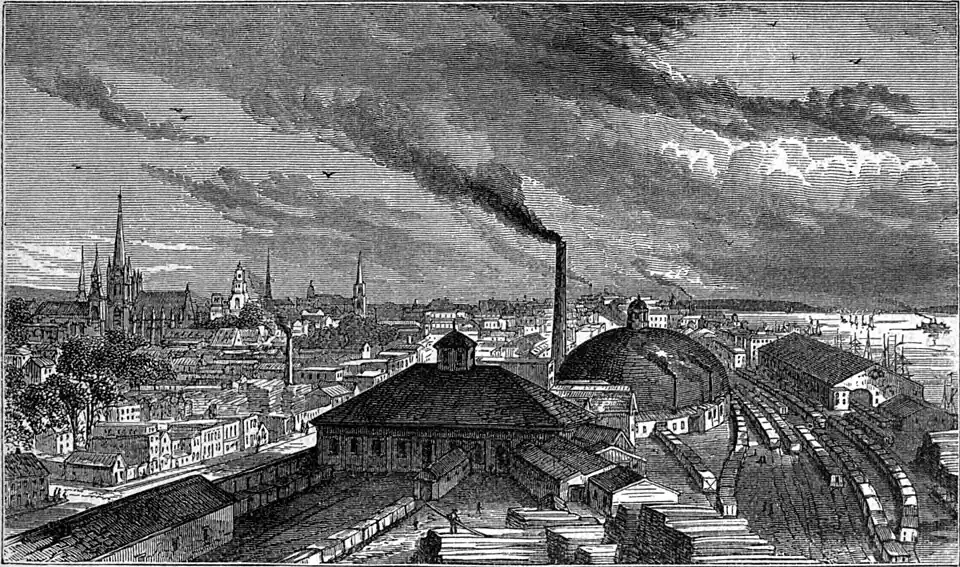 The amount of flour and grain in store Jan. 1, 1874, was: 4,850 bbls. of flour, 106,618 bushels of wheat, 39,718 of corn, 29,046 of oats, and 16,520 of barley. The receipts of apples in 1871 were 328,763 bbls.; in 1872, 91,334; in 1873, 84,880. The receipts of lumber in 1871 were 103,000,000 ft., of which 65,200,000 came by rail, 33,500,000 by lake, and 4,300,000 from Canada; in 1872 the receipts were 76,947,000 ft., of which 4,900,000 came from Canada. About 60,000 cattle were sold in the Detroit market during the year, valued at $2,422,000; hogs sold, 160,000, value $1,760,000; sheep sold, 120,000, value $435,000; total value of live stock sold, $4,617,000. The city contained 642 stores in 1871, and there were 27 incorporated companies, chiefly manufacturing, having an aggregate capital of $3,391,500. The manufactures are important, and have been rapidly extended within a few years. The vicinity to the Lake Superior iron region has given especial prominence to the working of iron, which employs 31 establishments, having an aggregate capital of $4,000,000, and an annual product of $10,000,000. These include 3 blast furnaces, 2 steam forges, a car wheel foundery, a manufactory of iron bridges, 11 machine shops, 5 boiler shops, 2 stove founderies, a manufactory of plumbers' and gas fittings, and a safe factory; to which may be added the railroad repair shops, the two blast furnaces and extensive rolling mills at Wyandotte, belonging to Detroit capitalists, and unenumerated establishments in the city. Besides the very extensive Pullman car works, there are two railroad car factories, producing $4,500,000 worth of cars annually; 12 saw mills, which in 1873 manufactured 44,188,000 ft. of lumber; 3 ship yards; numerous manufactories of woodwork, including several of chairs and furniture, 1 of organs, 2 of wooden ware, 1 of matches, several of boxes, of sash, doors, and blinds, &c., producing annually goods valued at about $4,000,000. In and near the city are 22 brick yards manufacturing about 54,000,000 bricks annually. There are 7 large flour mills, which in 1873 produced 212,000 bbls. of flour; about 60 breweries, malt houses, and distilleries, yielding 90,000 bbls. of beer annually; 16 tobacco factories, having an annual product of about $4,500,000; a large number of cigar factories, 17 tanneries, 4 steam cracker bakeries, 4 large manufactories of boots and shoes, 1 of white lead, 2 of chemicals, 1 of hats, caps, and fur goods, and several of confectionery. The Detroit copper-smelting works annually produce over $2,000,000 worth of ingot copper from Lake Superior ore. There are 3 national banks, with an aggregate capital of $1,900,000; 3 state banks, capital $350,000; and 4 savings banks, with $390,000 capital, of which all but one do a general banking business also. The aggregate deposits, Oct. 1, 1872, were $9,416,000. The Detroit fire and marine insurance company has a capital of $150,000, the Michigan mutual life insurance company of $100,000, and the Michigan health insurance and relief society of $10,000.—The government is administered by a mayor and a board of aldermen of 22 members (two from each ward) elected by the people for a term of two years. There are a court held by the recorder, a police court, and a superior court of civil jurisdiction; and the circuit and probate courts for Wayne county, and the United States circuit and district courts for the eastern district of Michigan, are held here. Detroit has a police force consisting of about 100 men, under the control of a board of four commissioners appointed by the governor of the state. The fire department, managed by four commissioners, has seven steam fire engines, two hook and ladder companies, and a fire alarm telegraph. The water works, valued at $1,221,752, are under the charge of five commissioners. The water is pumped from the river by three steam engines, having an aggregate capacity of 32,000,000 gallons daily, into the mains and a reservoir 1½ m. back, holding 10,000,000 gallons, and is distributed to every quarter of the city through 160 m. of pipe. The average daily consumption is 9,000,000 gallons. The city is furnished with gas by two companies, and has 1,137 street lamps. There are 40½ m. of paved street and 79¾ m. of sewers. Many of the streets are paved with wood. The assessed value of property in 1872 was $23,615,674; cash value, $78,718,913; taxation for all purposes, $785,248. The house of correction, with capacity for 450 prisoners, is used for the confinement of petty criminals. Directly opposite is a home for discharged female prisoners. The United States marine hospital, on the bank of the river, just above the city, commands a fine view of the Canada shore. The other principal charitable institutions are the Harper hospital, adapted for 500 patients, St. Mary's hospital (Catholic), St. Luke's hospital and church home (Episcopal), the German orphan asylum, the women's hospital and foundlings' home, the Protestant orphan asylum, St. Anthony's boys' orphan asylum (Catholic), St. Vincent de Paul's orphan asylum (Catholic), the free dispensary, the home for the friendless, the retreat for the insane, and the Hebrew widows' and orphans' society. In the ladies' industrial school vagrant children are taught the elements of learning and industry. The public schools are under the control of a board of 22 inspectors (two from each ward), elected by the people for two years, who appoint the superintendent of schools. A school census is taken between Sept. 1 and Oct. 10 of each year. In 1871 there were 28,779 children between the ages of 5 and 20 years, of whom 13,699 did not attend school during the year, and 12,092 between 8 and 14 years of age. The schools are divided into five grades: the high school and senior grades, in each of which the course is three years, and the junior, secondary, and primary grades, in each of which the course is two years. The statistics for the year ending Dec. 31, 1871, are 