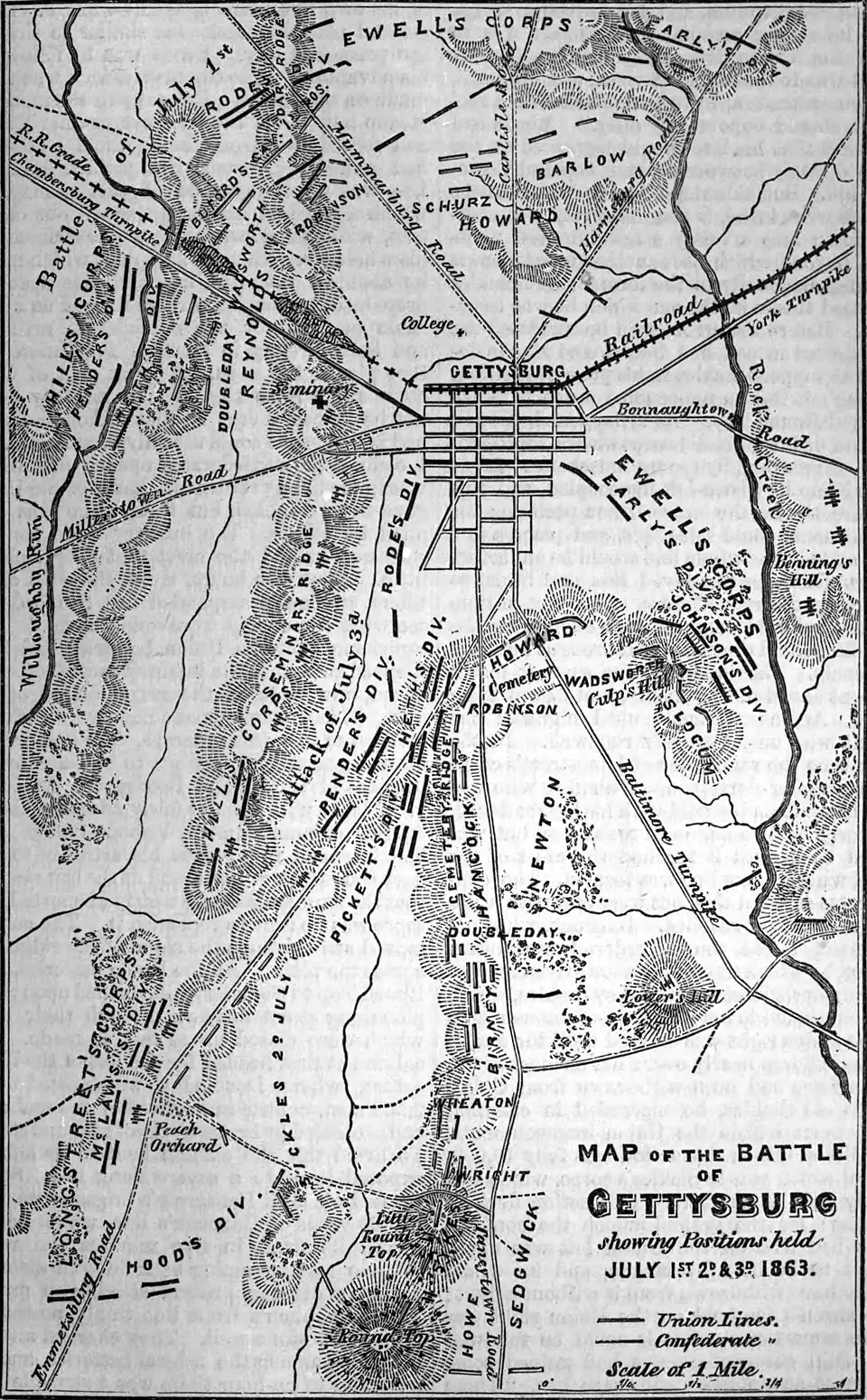 July 1. On the morning of July 1 Hill, whose corps was in the advance, learned that Gettysburg, from which he was distant about 6 m., was occupied by a Union force. Sending back to urge Longstreet to hasten his march, he moved on. In the mean while Reynolds had sent out a cavalry reconnoissance in the direction whence Hill was coming, and the forces came in collision about 2 m. N. W. of Gettysburg. Reynolds sent infantry to the support of his cavalry, and the action opened. He was killed at the beginning of the fight, and the command here devolved upon Howard. At first the Union forces were superior, and they gained decided advantages, taking nearly 1,000 prisoners. But in a few hours nearly the whole of Hill's corps came up from Chambersburg, and Swell's from Carlisle, both numbering about 50,000, while their opponents were less than half as many. The Union force was driven back in confusion through Gettysburg, losing about 5,000 prisoners. The remainder took up a strong position on Culp's hill, just south of the town. The Union loss in this action was about 10,000, half of whom were killed and wounded. The confederate loss in killed and wounded was probably somewhat greater; in prisoners much less. Meade, who was 15 m. distant, had learned that there was fighting at Gettysburg, and sent Hancock with orders to take command of the force there, and to decide what should be done; for, as it happened, Meade knew nothing of Gettysburg. Hancock decided that this was the place to give battle, and sent back word to Meade to hurry all his troops to the place. Some of these came up during the night, others early in the following morning, and finally, after a march of 35 m., Sedgwick's corps in the afternoon. Lee had in the mean while suspended operations until he could bring up his whole army.—July 2. Early in the morning the bulk of the two armies was in position. Southward of Gettysburg, at the distance of a mile, rises Cemetery ridge. It curves first northward, then westward, and finally runs southward, the whole length being about 3 m., the shape being like a fish hook. It rises in places into several craggy hills, each having its own name. That on the extreme south, forming the stem of the fish hook, is Round Top, separated by a ravine from Little Round Top; at the bend of the hook is Cemetery hill; Culp's hill forms the barb. The Union army was posted along the whole line of Cemetery ridge. Opposite this is Seminary ridge, upon which the greater part of Lee's army was posted; Ewell's corps, however, lay at the foot of Culp's hill, 2 m. distant. The forces present or close at hand were about equal, each numbering from 70,000 to 80,000 infantry and artillery. Between the two ridges is a valley in which and on the slope of Cemetery ridge were fought the actions of July 2 and 3. It is clear from what followed that Lee greatly underestimated the force opposed to him, and he resolved to attack it in its strong position. Longstreet was to assail the Union left at Eound Top, while Ewell was to make on the right, at Gulp's hill, “a demonstration, to be converted into a real attack should opportunity offer.” Meade had intended that his line should be posted on the ridge directly between Round Top and Cemetery hill. But this ridge, in the centre where Sickles was placed, is comparatively low, sinking down into a valley a few hundred yards wide, beyond which rises another wooded crest running diagonally to the former; and Sickles supposed this to be the one which he was to occupy. Before the error could be corrected the confederate attack had begun, and Meade decided to support Sickles in his present position, although it left an unoccupied space between him and Round Top. As it happened, Hood's division of Longstreet's corps struck this opening. Moreover, by some mischance Little Round Top had been left unoccupied, and this was the key to the entire Union position; for if the enemy could seize this, and place a few guns upon it, the whole line would be enfiladed. The confederates perceived this, and began to swarm up the rugged sides. But just in time Warren, who as engineer was examining the line, discovered the error, and brought up a few regiments. They reached the summit just a moment ahead of the enemy, and forced them back. Again and again until nightfall the assault was unsuccessfully renewed. In the mean time the remainder of Longstreet's corps were pressing fiercely upon Sickles, who was soon borne from the field with his leg shattered. His corps made a stubborn resistance, but was forced back until it reached the crest of the ridge, where a new line was formed. The confederates charged this, but were met with a fire from which they recoiled. Hancock, who now commanded the centre, ordered a counter-charge, by which the enemy were driven back to the ridge previously occupied by Sickles, which they continued to hold. Swell's demonstration on the Union right was delayed until the action on the left was nearly over; but as most of the Union force had been withdrawn from Culp's hill to aid Sickles, he succeeded in effecting a lodgment within the Union intrenchments. The Union loss in this action was fully 10,000, half of which was in Sickles's corps, which lost nearly half its numbers. This action decided nothing; for the ground which the confederates had won on the Union left was never meant to be held by Meade, and he would gladly have withdrawn from it without a fight; and Swell's foothold on the Union right was of no importance unless it could be followed up. Still the confederates had gained some apparent advantages; and, says Lee, “These partial successes determined me to continue the assault the next day.” From what he could then know, he was justified in this; for he had every reason to suppose that he had encountered the entire Union force, while less than half of his own had been engaged.—July 3. Lee's general plan of attack was similar to that of the preceding day. Ewell was