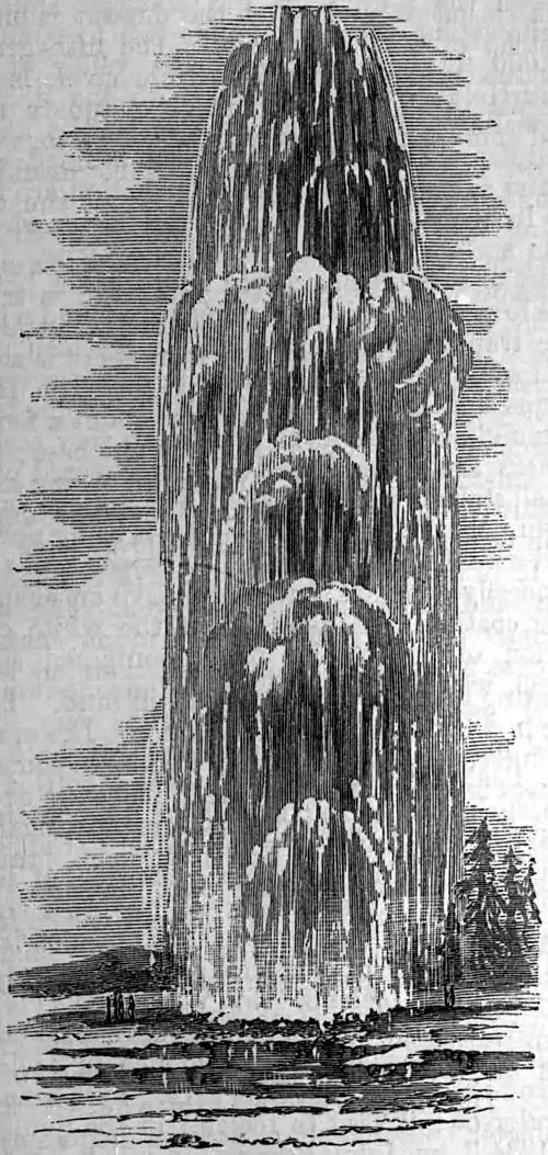 Another is named the Thud geyser, from the dull suppressed sound given off as the water rises and recedes. It has a beautiful scalloped rim, with small basins around it. This group of geysers is said to resemble a factory village, the steam rising in jets from more than 100 orifices. The third group lies three fourths of a mile S. E. of the second, at the base of a spur of the mountains, and extending up a ravine about 1,000 yards. They cover a space 500 yards in width. The temperature of 20 springs ranged from 130° to 196°. Near the centre of the group is a small lake, 600 ft. long by 150 wide, on the E. shore of which is a geyser spouting to the height of from 15 to 20 ft. There are three sulphur springs here, the only ones in the region, and S. E. of the lake is an iron spring. About 1,000 yards further S. is the fourth group, in a ravine about 1½ m. long and 300 yards wide. It contains many springs and geysers, the temperature of 42 of which ranged from 112° to 198°, the temperature of the air being about 60°. The principal geyser is at the mouth of the ravine. Its basin is circular and about 60 ft. in diameter, and its spring, in the centre, from 15 to 20 ft. The water is blue, and is constantly agitated. When in eruption the column is projected 100 ft. high, and is accompanied by immense clouds of steam. Near the upper end of the ravine is a spring around which the deposit is black, instead of the usual white. The fifth group, on the banks of the Fire-Hole river, is the largest of all, covering nearly a square mile and comprising a great number of springs and geysers. The temperature of 95 examined ranged from 112° to 196°, the air at the time being 70°. None of them are of much importance. One, from its resemblance to a shell, is named the Conch spring; its basin is triangular, from 8 to 10 ft. in diameter. A little below it, on the bank of the river, there is a fine geyser, with a crater 3 ft. high. The Horn geyser has a crater like a horn, about a foot in diameter at the top and 6 ft. at the base; it is in constant ebullition. The Bath spring has a square basin 30 ft. across, of unknown depth. The Cavern has a basin 15 by 20 ft. wide and 20 ft. in depth; the water is of a bright blue tint, and of wonderful clearness. The mud springs of this group are from an inch or two to 20 or 30 ft. in diameter, their contents varying from turbid water to stiff mud. They are in a constant state of agitation. The mud is of different colors, being pure white in some, in others brown, black, or blue. The sixth group is 2 m. S. W., on a small stream flowing into the Fire-Hole. They are in an open, prairie-like valley, for the most part marshy. The temperature of 34 of the springs varied from 106° to 198°. One of them is strongly chalybeate. The seventh group is on the Fire-Hole river, about 2½ m. S. of the preceding. The temperature of 20 of the springs ranged from 132° to 196°, when the air was from 70° to 76°. The largest has a basin over 400 ft. in diameter. Below it is another huge spring, named the Caldron, the view of which is almost obscured by the dense clouds of steam rising from it. The upper geyser basin lies in the valley of the same river, about 8 m. S. of the lower basin. It is not so large as the latter, covering an area of only about 3 sq. m., and it contains fewer springs; but the phenomena exhibited are far more remarkable. Most of the springs and geysers are near the river, extending along on both banks about 3 m. The temperature of 106 of them ranged from 113° to 196°, the average being over 170°, the temperature of the air being 67°. At the head of the valley, at its southern extremity, stands Old Faithful, a geyser so called for its regularity; it spouts at intervals of about an hour, throwing a column of water 6 ft. in diameter to a maximum height of 130 ft., and holding it up by a succession of impulses from 4 to 6 minutes. The great mass of the water falls directly back into the basin, flowing over the edges and down the sides in streams. When the action ceases, the water recedes out of sight, and nothing but the occasional hiss of steam is heard until the time approaches for another eruption. Its crater is a conical mound of geyserite about 12 ft. high, measuring at the base 145 by 215 ft. and at the top 54 by 20 ft. Near it are four extinct geyser cones. On the opposite side of the river are the Beehive and the Giantess. The former is a silicious cone 3 ft. in height, 20 ft. in circumference at the base, and 3 by 4 ft. in diameter at the top, with an oval orifice 3 by 2 ft. in diameter. When in action, which occurs once in about 24 hours, it throws a column of water entirely filling the crater to a height which, says Langford, was found by triangular measurement to be 219 ft. The eruption lasted 18 minutes, and the stream did not deflect more than 4° or 5° from a vertical line. Dr. Hayden witnessed three eruptions, which lasted from 4½ to 15 minutes; he measured the height of but one, which was over 100 ft. He describes the column as fan-shaped, and says that no water falls from it, but it is resolved into spray which appears to evaporate as soon as formed.