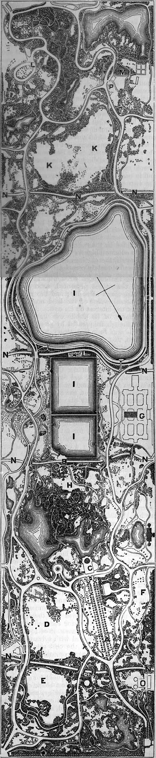 A, the Mall; B, Belvedere; C, Terrace; D, Green; E Ball Ground; F, East Green; G, site for Art Museum; H, Ramble; I, I, I, Reservoirs of City Water Works; K, K, the Meadows; L, Harlem Heights; M, Mount St. Vincent; N, N, Subways for street traffic; O, temporary Museum and Offices; P, temporary Museum, Refectory, and Offices.