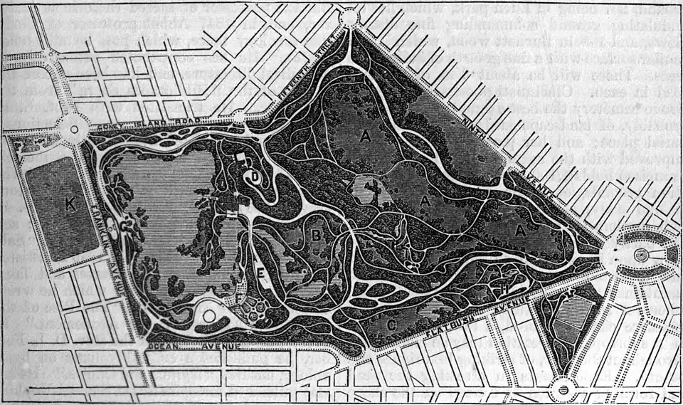 Until some years after the middle of the present century no city in North America had begun to make provision for a park. To a certain extent cemeteries were made to serve the purpose. In 1849 Mr. A. J. Downing began in the “Horticulturist” a series of papers which were widely copied and did much to create a demand on this subject. At length a large tract of land was provided in New York, upon which in 1858 the preparation of the present Central park was begun. The topography of the ground was in all important respects the reverse of that which would have been chosen with an intelligent understanding of the desiderata of a park. The difficulties presented could only have been tolerably overcome by an enormous outlay. The popularity of the parts of the park first prepared, however, was so great that the necessary means for improvements on a large scale were readily granted. The magnitude of the operations (nearly 4,000 men being at one time employed on the works), the rapidity of the changes wrought, and the novelty of the scenes presented, soon gave the enterprise great celebrity; and the rapid rise in the taxable value of the land near it more than met the interest oh its cost. An efficient management of its public use was maintained, and though frequented by great crowds of people it was found, contrary to general expectation, that a degree of good order and of social amenity prevailed, nowhere surpassed and rarely equalled in the public places of Europe. Philadelphia, Brooklyn, Albany, Providence, Baltimore, Buffalo, Chicago, St. Louis, Cincinnati, Montreal, and San Francisco have since each acquired land for one or more parks of considerable extent, the average being over 500 acres. As in the case of New York, the selection of ground has often been made more with reference to other considerations than to that of fitness for the intended use. Some are as yet only held for future use, while in others provisions essentially temporary, and which will be in the way of substantial improvement, are made; none are so far complete and well fitted as fairly to illustrate the ends which a park should be designed to serve. — The Central park of New York is 2½ miles long and half a mile wide, but this space is practically divided by the reservoirs of the city water works, which are elevated above its general level and occupy 142 acres. Deducting besides this certain other spaces occupied for special public purposes, the area of the park proper is 683 acres. Of this, 55 acres is meadow-like ground, 54 in smaller glades of turf, 400 of rocky and wooded surface, 43 in six pieces of water, the largest being of 20 acres, 15 in riding ways, 52 in carriage ways, and 39 in walks. There are 5½ m. of rides, 9½ m. of drives, and 28 m. of walks. Omitting a few by-roads, the average breadth of the drives is 50 ft., and of the walks 13 ft. There are 8 bridges (over water) and 38 tunnels and subway arches, 15 of which are concealed from view by plantations carried over them, and all of which are expedients for reconciling within narrow limits the large amount of foot, horse, and wheel room required with sylvan and pastoral landscapes. On the east side, near the middle of the parallelogram containing the park and reservoirs, ground is reserved for a great museum of art; and beyond its boundary on the west side another plot is held for a museum of natural history. The first block of each is now building. There are carriage and foot entrances at the two southern corners, and between them on the south end, at the termini of street railroads, there are two foot entrances; and 14 other entrances are in use or provided for. From the S. E. or Fifth avenue approach, which is most used, the visitor is led by a nearly direct course to a slightly elevated point in the interior of the park, northwardly from which, at great cost in reducing the original rocky knolls, broad green surfaces have been prepared (D, E on the map), and views of a tranquil landscape character obtained of considerable extent. At the most distant visible point a small tower of gray stone (B) has been built to draw the eye, and the perspective effect is aided by the character and disposition of the foliage, and especially by an avenue of elms (A) leading toward it. At the end of this avenue, termed the mall, the ground falls rapidly to the arm of a lake, and here a structure called the terrace (C) has been introduced, which, though mainly below the general plane of the landscape and unobtrusive, supplies a considerable shelter and place of reunion. It is designed to be richly decorated with sculptured works. On one side of it is the concert ground of the park, on the other a fountain surmounted by a bronze typifying the angel of Bethesda. The concert ground is overlooked by a shaded gallery called the Pergola, back of which is a small house of refreshment in cottage style. On the opposite side of the water is a rocky and wooded slope, threaded by numerous paths, called the ramble (F). These with the green (D), play ground reserved for the scholars of the public schools, two irregular bodies of water, and several rocky knolls (on one of which is the Kinderberg, a place for little children), form the chief features of the south park. Those of the north are a central meadow (K) divided by a rocky spur, the high wooded ground beyond it (L), with a steep rocky face on the north, and an intermediate glen with a chain of waters. The number of visits to the park sometimes exceeds 100,000 in a day, and is about 10,000,000 a year. —Prospect park of Brooklyn, N. Y., contains, with the adjoining parade ground, 550 acres. There is included in it a considerable amount of old wood, and for this reason, and because of the better soil, climate, and early horticultural management, it has a finer rural and more mature character than the New York park, though its construction was begun eight years later. It has about 6 m. of drives, 4 m. of ride, and 20 m. of w