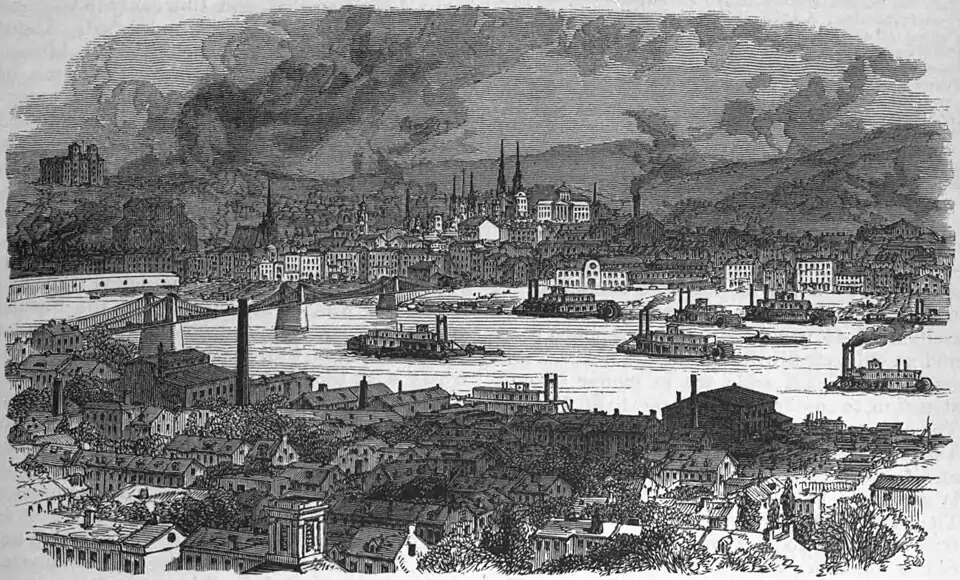 —The city is divided into 37 wards, and is governed by a mayor, a select council of 74 members (two from each ward), and a common council of 44 members. It has a police force and an efficient fire department. Water works on a magnificent scale are in course of construction, to cost from $4,000,000 to $6,000,000. The assessed value of property is $172,000,000. The city debt amounts to about $13,000,000, and the real estate owned by the municipality is estimated to be worth about the same sum. The state supreme court for the western district meets here, and two sessions of the United States courts for the western district of Pennsylvania are held here annually. Among the principal charitable institutions are the western Pennsylvania hospital, with a department for the insane at Dixmont, on the Pittsburgh, Fort Wayne, and Chicago railroad; the city general hospital, the homœopathic hospital and dispensary, the Pittsburgh infirmary, the Pittsburgh free dispensary, the mercy hospital, the home for destitute men and young men's home, the Episcopal church home, the home for destitute women, and the Roman Catholic orphan asylum. The city is divided into 36 school districts, and the public schools are under the control of a board of education consisting of one member from each district. There are 53 school houses, and the schools are graded and include a high school. The number of teachers employed during the year ending Sept. 1, 1874, was 383 (56 male and 327 female); number of pupils enrolled, 21,009; average daily attendance, 12,873; value of school property, $1,904,500. The expenditures for the year ending June 1, 1874, amounted to $601,629 19, of which $273,895 08 was for salaries. The Pittsburgh female college (Methodist) is a flourishing institution. The western university of Pennsylvania was founded in 1819. It has a collegiate department, with classical, scientific, and engineering courses, and a preparatory department, with classical and English courses. In 1873-'4 the number of instructors was 17; of students, 252, of whom 80 were in the collegiate and 172 in the preparatory department. It has a library of about 2,500 volumes, extensive philosophical and chemical apparatus, and a cabinet containing more than 10,000 specimens in geology, conchology, mineralogy, and zoology. Connected with it is an astronomical observatory in Allegheny City. There are two theatres, an opera house, an academy of music, and several public halls. There are 9 daily (3 German), 1 semi-weekly, and 19 weekly (3 German and 1 Welsh) newspapers published. There are 141 churches and chapels, viz.: 4 African Methodist Episcopal, 8 Baptist, 1 Church of God, 1 Congregational, 1 Cumberland Presbyterian, 2 Disciples', 10 Episcopal, 1 Evangelical Association, 1 German Evangelical, 2 Jewish, 9 Lutheran, 6 Methodist, 21 Methodist Episcopal, 1 New Jerusalem, 16 Presbyterian, 5 Reformed, 2 Reformed Presbyterian, 34 Roman Catholic, 1 Unitarian, 11 United Presbyterian, 1 Universalist, 2 Welsh, and 1 Welsh Calvinistic.—The territory in which Pittsburgh is situated was, at the opening of the French and Indian war, claimed by the English under a charter from the crown, strengthened by a treaty with the Iroquois; and the French laid claim on the ground of discovery. In February, 1754, the English began building a stockade at the river junction, but were driven from it in April by a French force under Captain Contrecœur, who proceeded at once to erect a fort, which he called Duquesne, in honor of the governor of Canada. This fort at once became the great centre of all the military operations of the French in this part of the country, and its commanding position rendered its restoration to the English a matter of the first importance. In 1755 Gen. Braddock, at the head of the largest expedition that had ever crossed the Alleghanies, was sent to recapture it. On July 9 he was met and defeated by the French and Indians at a point on the Monongahela 10 m. above the fort. Twelve of the British soldiers taken prisoners on that occasion were burned by the savages. A force of 800 men under Major Grant was cut to pieces in a second attempt to take the fort, Oct. 15, 1758; but a third, by 6,000 men under Gen. Forbes, Nov. 25, 1758, was successful, the French, disheartened by the failure of several attacks on the advancing army, having abandoned and set fire to it on the day preceding. A new and large fort was completed about January, 1759, and was called Fort Pitt, in honor of the British minister. Several expeditions were fitted out against it by the French, but they all failed. In 1764 the first efforts were made toward building a town. In October, 1772, the post was abandoned by the English. A controversy between Pennsylvania and Virginia as to the boundary line was the subject of much negotiation, and gave rise to ill feeling between the two states, Virginia claiming the territory on which the city stands under a charter from James I., and Pennsylvania under a charter from Charles II. A company of Virginians took possession of the fort under an order from the Virginia convention, Aug. 11, 1775. On Aug. 31, 1779, commissioners appointed by the two provinces met in Baltimore, and agreed upon the boundary, which was duly ratified by their respective legislatures. During the excise troubles of 1791-'4, which culminated in the “whiskey insurrection,” Pittsburgh was the scene of much violence. It was incorporated as a borough in 1804, and chartered as a city in 1816. In 1845 a conflagration destroyed the entire business quarter, consuming $5,000,000 worth of property.