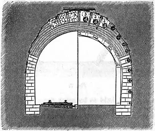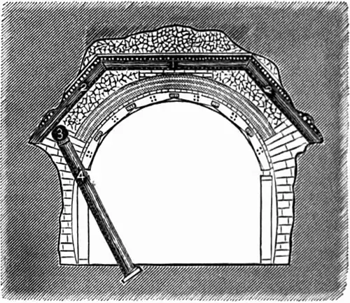 TUNNEL, a subterranean or subaqueous way, constructed for purposes of passage. In mining, the term is often applied to horizontal excavations, especially to such as are known by the designations gangway, heading, drift, and adit, used as underground roads or for the passage of water. (See Adit.) Herodotus mentions a tunnel in the island of Samos, cut through a mountain 150 orygia (900 ft.) high. Its length was seven stadia (4,247 ft.), and its cross section 8 ft. high by 8 ft. wide. In Bœotia a tunnel was constructed for the drainage of Lake Copais. When Cæsar arrived at Alexandria, he found the city almost hollow underneath from the numerous aqueducts; every private dwelling had its reservoir, supplied by subterranean conduits from the Nile. The aqueducts of the ancient Romans, and of the Peruvians and Mexicans, included remarkable tunnels. (See Aqueduct.) Among the many Roman aqueducts on which tunnels were built were the Aqua Claudia, of which 36½ m. passed underground; the Aqua Appia, built in 312 B. C., 11,190 Roman paces in length, 11,130 being underground and arched; and the Aqua Virgo, 14,105 paces long, 12,865 underground. A tunnel was begun in 398 B. C. to tap Lake Albanus, at the instance, Livy tells us, of the oracle of Delphi. It was 6,000 ft. long, 6 ft. high, and 3½ ft. wide. Fifty shafts were sunk on its line, and the work was finished within one year, though it was driven through the hardest lava. A similar work of greater magnitude was undertaken to connect Lake Fucinus (now Celano) with the river Liris (now Garigliano); 30,000 men were employed on it for ten years, and it was finished at a vast expense A. D. 52. A minute account of the modern clearing out of this work by the Neapolitan government may be found in “Blackwood's Edinburgh Magazine,” vol. xxxviii., p. 657. The accuracy of the surveying in these works is astonishing when we consider the rudeness of the instruments. Among those used in levelling by the Romans were the libra aquaria and dioptra, of which we have no clear description. The chorobates seems to have been preferred. It consisted simply of a rod or plank about 20 ft. long, mounted on two legs, at its extremities, of equal length. The rods or legs were secured by diagonal braces, on which were marked correctly vertical lines. A plumb line attached at each extremity, and passing over these diagonal braces, indicated whether the instrument was level. When the wind prevented the plumb bobs from remaining stationary, a channel in the upper edge of the horizontal rod was filled with water, and if the water touched equally both extremities the level was supposed to be correct; and then the observation of the descent or elevation of the ground was made with accuracy.