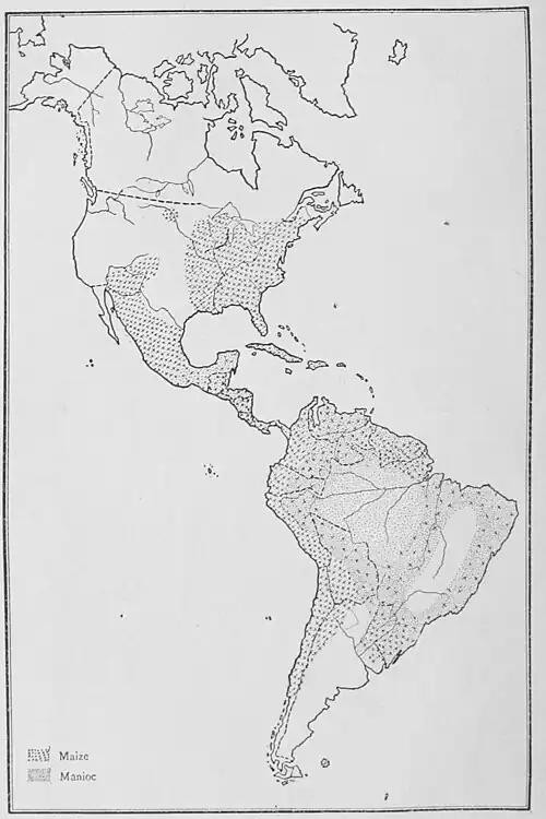 There are just two cultivated native food plants, maize and manioc (cassava), that rise to the level of chief staples. Both take the highest rank in excellence among the world's foods, and after the epoch-making discovery of Columbus were quickly spread to other parts of the world.[8] The uniqueness of these plants and the sharp contrast they make when compared with the cultivated staples of the Old World, is the strongest possible argument for the independent development of American culture.