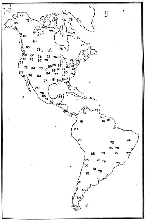 From this it appears that we have the most data for the United States, but, in general, all the larger parts of both continents are represented in some fashion. Notwithstanding such discrepancies, the data as given should approximately outline the general distribution of the cephalic index.