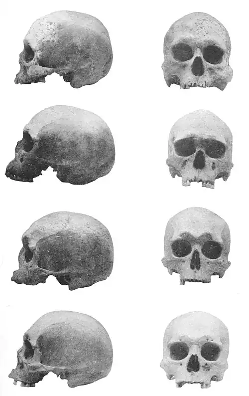 Fig. 93. Two Skulls from the Arctic Coast of North America and Two from Tierra Del Fuego, two views of each: The first and second pairs are Eskimo; the third, from a village site on Grande Island (150 miles N.W. of Cape Horn), and the fourth Yahgan, Furlong Collection