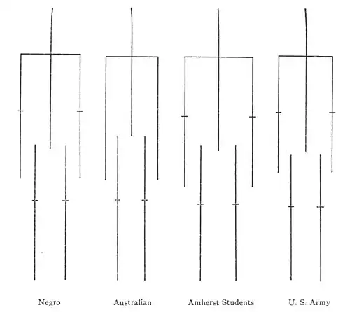Fig. 96. Bodily Forms from Various Races—Negroes, Australians, and United States Soldiers, from Thompson, 1880. I; Amherst Students, from Hitchcock, 1888. I. There is some doubt as to the accuracy of the United States Army data, but the variation shown here serves to emphasize the homogeneity of the New World types