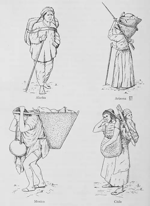 Fig. 12. Various Methods of Using the Tumpline. Mason, 1896. I