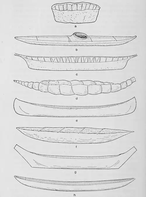 Fig. 13. Types of Canoes Used in the New World. a. The "Bull Boat," Bison Area; b. Eskimo Kayak; c. Eskimo Woman's Boat; d. Balsa, or Reed Boat; e. Birchbark Canoe; f. Fuegian Bark Canoe; g. North Pacific Coast Dug-Out; h. Amazon Dug-Out