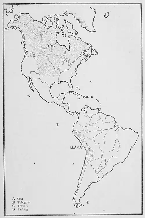 It may be worth noting that dog packing in particular is a concomitant of those hunting tribes following a regular migratory circle. The excursions of the Eskimo to the caribou ranges, the corresponding shifts of the Canadian Indians, and the bison-hunting expeditions of the Plains were in pre-Columbian days facilitated by pack trains of dogs. The intrusion of this method into the inland salmon area is consistent with the journeys then made to gather food, as we have stated. On the contrary, topographical conditions in California made large movements unnecessary, which may be one reason why dog packing was not adopted. The maize areas were more independent and had little use for this trait. So far as we know, dog transportation was not in vogue in the area of intensive maize culture. Mexico and the Pueblo area had no way of land transport except by human carriers, and it is not until Peru is reached that the use of the llama comes to notice. This small, camel-like animal has little more carrying power than a large dog, but is particularly well adapted to mountain travel. For the remainder of South America our information is vague, but so far there is no reason to believe that the dog or any other animal was used for transport.
