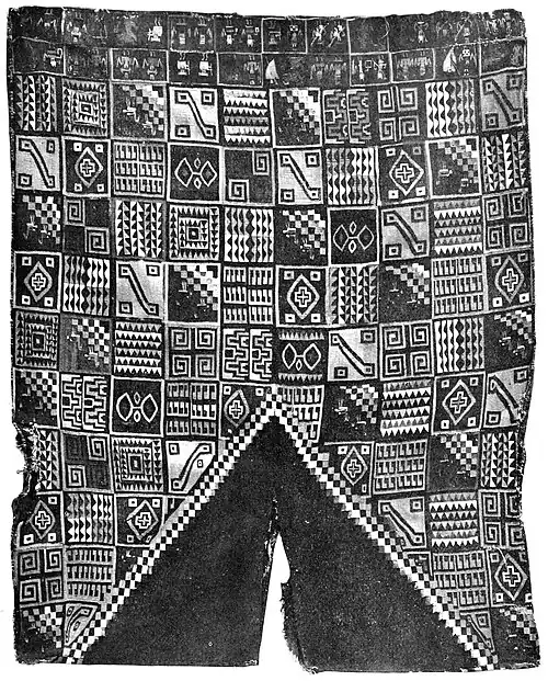 When we come to South America, we find that certain accidents have preserved us a good series of aboriginal textiles from Inca culture. In the technique of design these ancients were remarkably proficient, even to the extent of using complex color sequences.[24] On the whole, their designs tend to be realistic figures: men, cats, birds and fish being distinguishable in many degrees of conventionalization. In fact, we find here the best illustrations of the geometric biases in loom weaving. Associated with this art is an equally superior development of pottery decoration. One prominent feature of this pottery is the introduction of life forms, so that we have jars representing persons, birds, monkeys, fishes, etc., in which the modeling is of a high order. The decorations are in both color and incised work. In color, we have the great triumph of Nasca and Titicaca ware, so far superior to anything yet discovered in the New World. The painted designs upon this pottery are comparable to those upon cloth in that they have the same realistic tendencies. Certain fixed conventional forms appear both on pottery and cloth, suggesting the fundamental unity of design concepts for both ceramics and textiles.