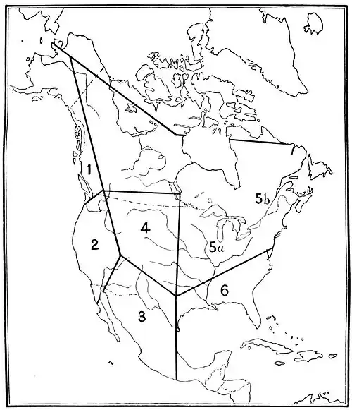 Fig. 37. Decorative Design Areas in North America: 1. North Pacific Coast Center; 2. California Center; 3. Southwest, or Pueblo Center; 4. Plains, or Bison Center; 5. Eastern Center—subtypes a and b; 6. Southeastern, or Gulf Center