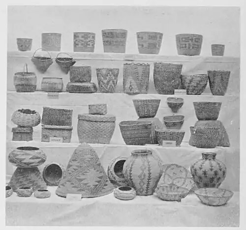 There is, however, a more direct approach to the problem by the analytic comparison of designs. Kroeber[10] has carefully analyzed the designs of California baskets and Plains beadwork in search of the prevalent design units. When these are found, they prove to be, in the main, very simple geometric forms and though many can be very closely matched for the two areas, their very simplicity, taken with the principle of textile limitation, lessens the probability of their common origin. On the other hand, if we take more complex design wholes we find very little correspondence between the two areas, for each has a number of highly unique designs not found in any other part of the world. Hence, even this method tends to assert independence of origin.
