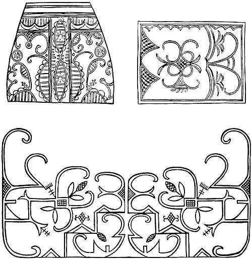 Fig. 42. Decorations on Birchbark from Eastern North America. The upper figures represent the side and bottom of a bark vessel from the Penobscot Indians. The lower sketch is a typical "double curve" design. (Center 5b, Fig. 37.) Speck, 1914. I