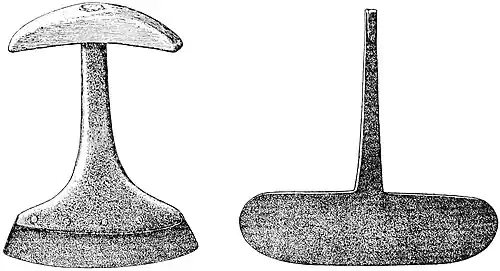No satisfactory evidence of casting or even beating in dies has been found for regions north of Mexico. Ingenious experiments by Cushing[16] and others have demonstrated the possibility of making all the objects so far found here with the most primitive tools. Stefánsson[17] collected specimens from Coronation Gulf, showing long, slender rods fashioned by beating together thin sheets of copper.