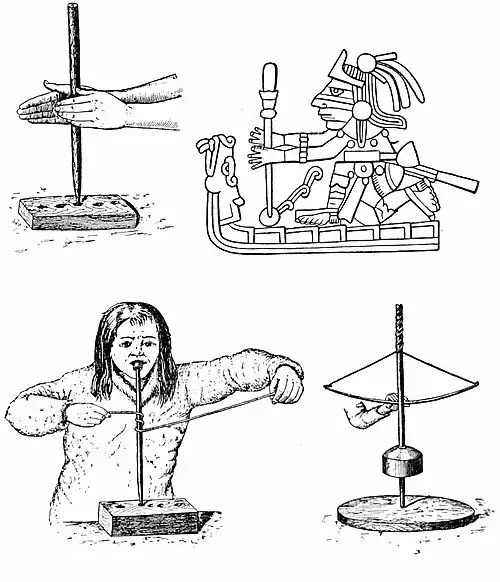 presence there as of Spanish origin. Again, the California drill is operated on a slightly different principle, and its very limited distribution suggests its intrusion. If these forms of the pumpdrill are truly independent inventions, they are evidently recent, for they would with time have spread over large areas. In short, we are justified in assuming that the rotating tool or wheel had no place in the original mechanical concepts of the New World.
