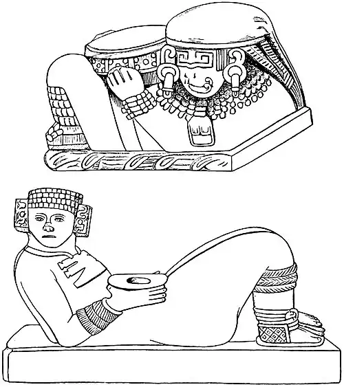 Fig. 62. Statues of the Chacmool Type. The upper one from Mexico, the lower from Yucatan. Sanchez, 1877. I