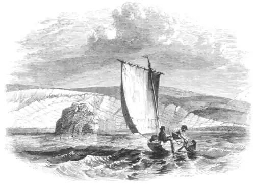 At length we are under Whitenose, that bold chalk cliff that is so prominent an object as the eye roves along the coast line from Weymouth. Here we turn the boat's head to the southward and throw the dredge overboard in fourteen fathoms. And while I am enjoying, with the line in my hand, what a dredger particularly likes to feel, the vibration produced by the instrument as it rumbles and scrapes over a moderately rough bottom, telling that it is doing its work well,—we will gaze with admiration on this magnificent precipice of dazzling white that rears its noble head behind us. It is the termination of that range of chalk hills which, with some few interruptions, intersect the kingdom from the Yorkshire coast to Dorset; and stands in simple majesty, the snowy whiteness of its vast face unvaried, except by the slanting lines which mark the dipping strata running across it, and which look so fine and so regular as if they had been drawn by the pen of a geometrician. My companion told me the story of a lad of thirteen, who four years ago fell from the loftiest part of the summit, 500 feet above the sea. It is true a great part of this descent was performed by rolling and sliding, but for fifty feet the fall was absolutely perpendicular. The boy had been seeking rabbits, which are very numerous on the downs above, when he fell over. Thirteen hours he lay helpless at the bottom, in the hardest frost of the winter of 1849-50, and was then found with a broken arm and thigh, but with no other important injuries.