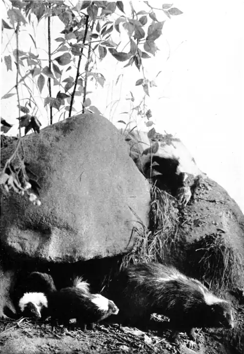 The babies are from six to ten in number and live in and around the burrow until the following spring. They appear to be full-grown at this time and make homes for themselves. When taken early, baby Skunks make fine pets. The Indians discovered that. So also has Dr. Merriam, who says, "They are cleanly, attractive, gentle, playful and affectionate." He writes: "These Skunks would climb up my legs and get into my arms. They liked to be caressed and never offered to bite."