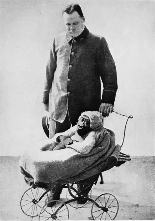 | "Dinah," this baby Gorilla, is very proud when her nurse dresses her in her white bonnet and cloak and takes her for an airing in the baby carriage. She is two years old and weighs forty pounds. When full grown, at fourteen years of age, she may tip the scales at five or six hundred pounds. |