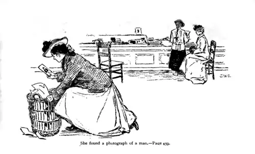 She thought it was perfectly grand, and she cleared all her photographs of boys away and began to make up her mind who the One would be, in hopes to be taken in. She probably never would have been, though, if it hadn't been for an accident. She and Ben and I were down in the town together with Mademoiselle, and Mademoiselle took us up to the photographer's to see about some pictures of hers. She has them done there and not by the New York man that comes once a year for the graduating class, because they're cheaper. Well, while we were waiting around Eleanor looked in a waste-basket to get a piece of paper to wipe some mud off her shoe, and there she found a photograph of a man. It was perfectly good enough except for a big blot of ink on the lowest right-hand corner, and that was prob'ly why it was thrown away. Eleanor thought she'd take it just for fun, and so she slipped it into a book she had and carried it home.
