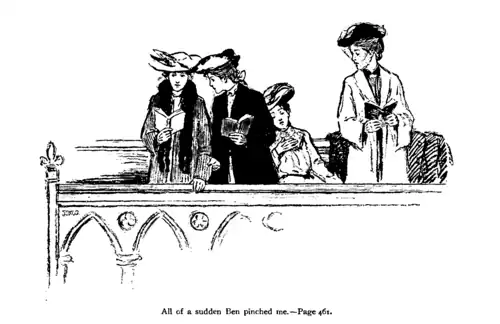 First I thought how funny it was that Eleanor never told us he was in the choir, and then I remembered that of course she didn't know he was in the choir, because she didn't know him, and yet it seemed as if she must know him. I looked at Ben every once in a while, and her cheeks were as red as could be, and she was whispering to herself that way she does when she's planning out some really big thing. Eleanor just wiggled around, as I said.