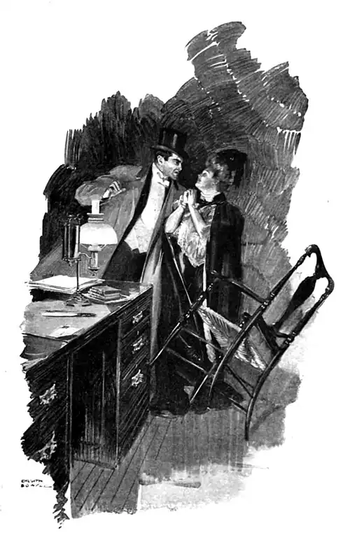 Once there, she sank quivering into a chair, while he proceeded gravely to the desk, put down the lamp,—superfluous now, the gas having been lighted,—and after a moment's thought faced her, with a contemptuous smile and lift of his shoulders, thrusting hands deep into his pockets.