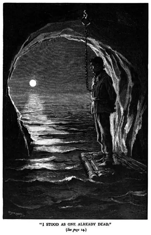 My neck was fixed to the chain above, my feet to the timber in the sea below. The words of my terrible sentence burst upon me now with all their fiendish meaning. As the tide went down the whole weight of the raft would gradually drag my body from my head. The horror of such a fearful doom almost benumbed my faculties, and I stood as one already dead, being swayed up and down by the light swell that found its way into the cave.
