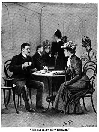 The hour was now between four and five. I suddenly remembered that I had promised to meet a man in some tea-rooms which had lately been opened in Bond Street. I found the right place, and walked down a long, narrow passage, which opened into a small courtyard surrounded by coffee- and tea-rooms of different descriptions. The seclusion and unexpected quiet of the place were refreshing; the soft notes of distant music took my steps upstairs to the first floor, and the next instant I had entered a tea-room, as still and peaceful as if London were miles away. Some girls, tastefully dressed and looking like ladies, were waiting on the visitors. I seated myself at a small table and waited for my friend. I looked at my watch—he was late. I resolved to wait for him for a few moments, but before many had passed, one of the young waitresses approached me with a telegram, asking if my name was Head. I replied in the affirmative, and tore it open. It was from my friend. He had suddenly been called out of town, and could not keep his appointment. I ordered tea for myself, and leaning back in my chair looked around me. The room was tastefully decorated with a certain aiming after simplicity, which produced a most inviting effect. My tea was brought on a small tray, and at the same time a girl, very quietly dressed, took the place opposite to mine. My first glance caused me to look at her again. She was the dark-eyed girl whom I had seen that morning coming down Mme. Koluchy's steps. I observed that her eyes, larger than those of most Englishwomen, wore a strained expression; otherwise she was fresh and young-looking.