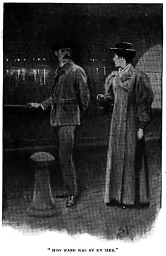 I looked up quickly. Already he was lost in the throng of passengers who had left the train. I had no opportunity to give him any warning; there was nothing for it but to obey his directions—take a ticket to Yarmouth and hasten on board. In a few moments I found myself steaming down the river and out into the Solent. The sun had set, and the moon would not rise for an hour or two. I stood on deck looking back at the lights of Lymington as they were reflected in the water. Suddenly I felt someone touch me. I looked round, and Miss Ward was by my side.