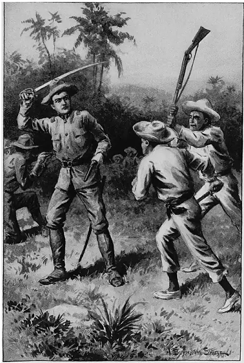 "They are coming!" came from Dan Casey, just as the nearest of the trees was gained. "Back, ye rascals!" he shouted, and fired as quickly as he could. Casey was right; the Tagals were surrounding them, and now they had to fight back to back, in as hot a contest as the young captain had ever seen. They were clearly outnumbered, but retreat was impossible, for the Filipinos surrounded them upon every side.
