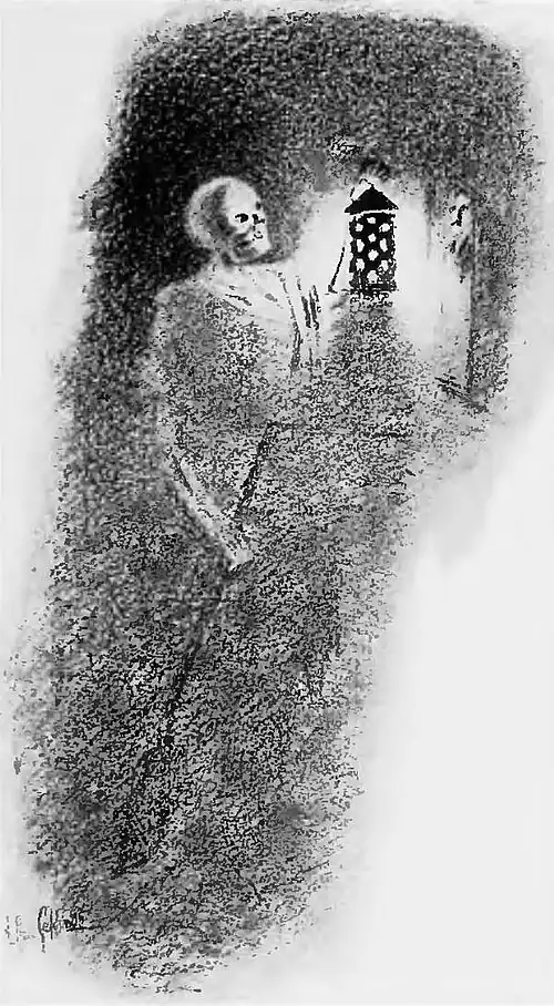 He now gave up all hope of ever frightening this rude American family, and contented himself, as a rule, with creeping about the passages in list slippers, with a thick red muffler round his throat for fear of draughts, and a small arquebuse, in case he should be attacked by the twins. The final blow he received occurred on the 19th of September. He had gone downstairs to the great entrance-hall, feeling sure that there, at any rate, he would be quite unmolested, and was amusing himself by making satirical remarks on the large Saroni photographs of the United States Minister and his wife, which had now taken the place of the Canterville family pictures. He was simply but neatly clad in a long shroud, spotted with churchyard mould, had tied up his jaw with a strip of yellow linen, and carried a small lantern and a sexton's spade. In fact, he was dressed for the character of "Jonas the Graveless, or the Corpse-Snatcher of Chertsey Barn," one of his most remarkable impersonations, and one which the Cantervilles had every reason to remember, as it was the real origin of their quarrel with their neighbour, Lord Ruiford. It was about a