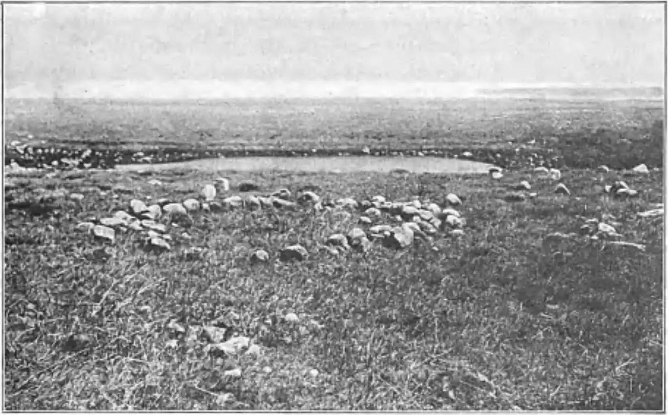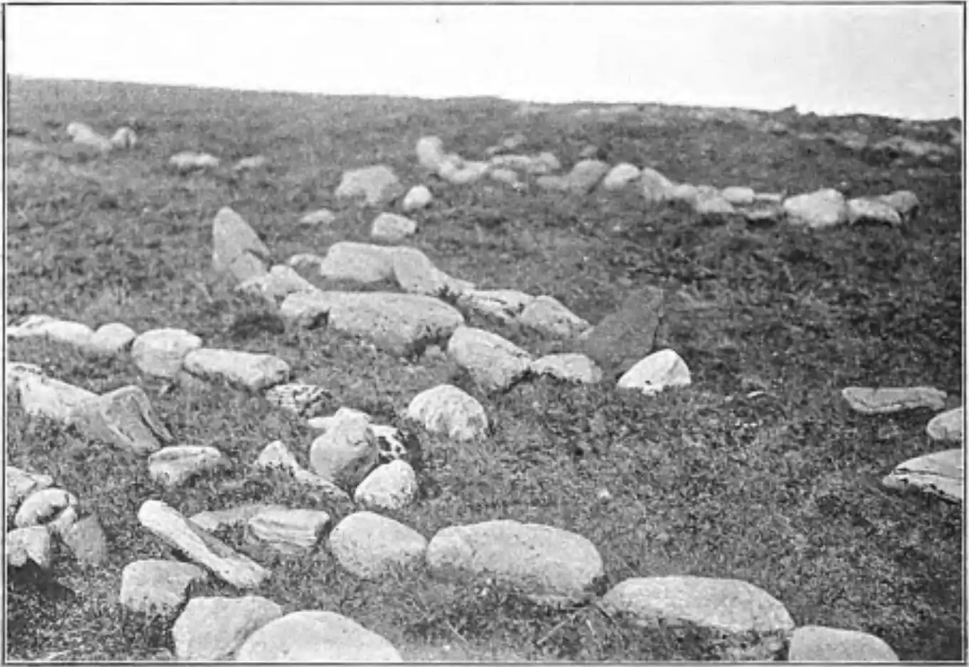 HOUSE RUINS. — It has been stated in the Descriptive Part that at several places along the coast of the Caribou Eskimo area there are ruins of permanent winter houses, a type of dwelling which the present population of these regions never use. These I have seen near the Hudson's Bay Company's post at Chesterfield Inlet (Igluligârjuk) and on Sentry Island (Arviaq); but according to the Eskimos there are also ruins at the following places[1]: Inugjivik and Iglulik near Fullerton; Depot Island (Pitiulâq); Silumiut between Depot Island and Chesterfield Inlet; Igluligjuaq on the north side of Chesterfield Inlet just opposite the above-named Igluligârjuk; Iviktôq south of Corbett Inlet; Qiqertarjuaq — which, in spite of its name, "the big island", is now actually a naze — south of Dawson Inlet; Ivik, south of Sentry Island and Eskimo Point, presumably at the mouth of McConnell River; and finally in the interior, Ikerahak, at Maguire River by the sledge trail from Hikoligjuaq to Sentry Island. Ellis mentions ruins from Marble Island[2].