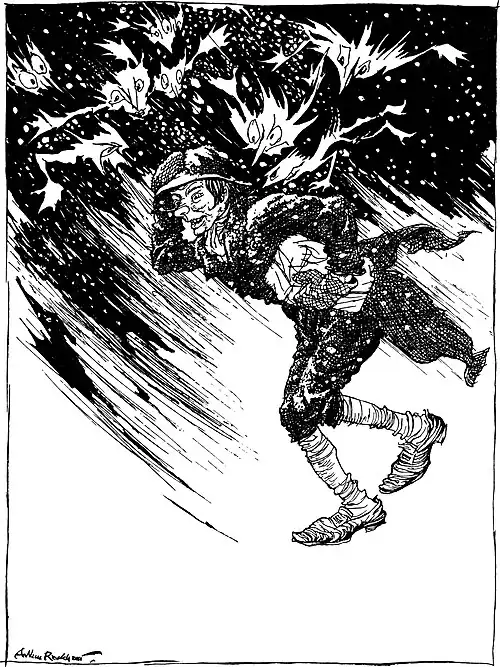 And a breezy, goose-skinned, blue-nosed, red-eyed, stony-toed, tooth-chattering place it was, to wait in, in the winter-time, as Toby Veck well knew. The wind came tearing round the corner—especially the east wind—as if it had sallied forth, express, from the confines of the earth, to have a blow at Toby. And oftentimes it seemed to come upon him sooner than it had expected, for bouncing round the corner, and passing Toby, it would suddenly wheel round again, as if it cried “Why, here he is!” Incontinently his little white apron would be caught up over his head like a naughty boy’s garments, and his feeble little cane would be seen to wrestle and struggle unavailingly in his hand, and his legs would undergo tremendous agitation, and Toby himself all aslant, and facing now in this direction, now in that, would be so banged and buffeted, and touzled, and worried, and hustled, and lifted off his feet, as to render it a state of things but one degree removed from a positive miracle, that he wasn’t carried up bodily into the air as a colony of frogs or snails or other very portable creatures sometimes are, and rained down again, to the great astonishment of the natives, on some
