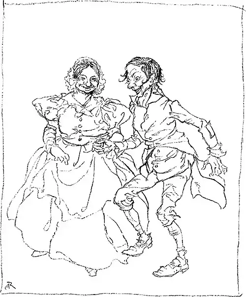 At its proper time, the Banquet was served up. Trotty in voluntarily repaired to the Hall with the rest, for he felt himself conduced thither by some stronger impulse than his own free will. The sight was gay in the extreme; the ladies were very handsome; the visitors delighted, cheerful, and good-tempered. When the lower doors were opened, and the people flocked in, in their rustic dresses, the beauty of the spectacle was at its height; but Trotty only murmured more and more, “Where is Richard? He should help and comfort her! I can’t see Richard!”