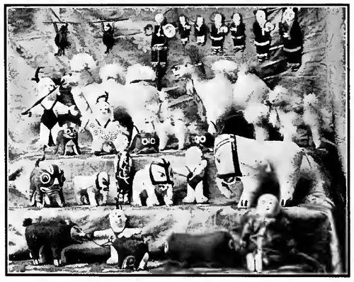 The most common rattles representing various kinds of fowls and animals known and unknown are made of clay. Others are in the form of fat little priests that make one think of Santa Claus, or little roly-poly children that look like the little folks who play with them.