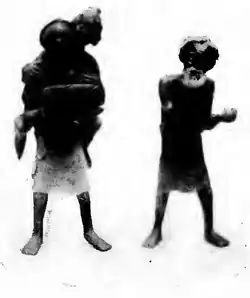 But, perhaps, among the most interesting of his toys were his clay whistles. Some of these burnt or sun-dried toys were hollow and in the shape of birds, beasts and insects. When blown into, they would emit the shrillest kind of a whistle. In others a reed whistle had been placed similar to those in the dolls, and these usually had a bellows to blow them. Whether cock or hen, dog or child, they all crowed, barked, cackled, or cried in the self-same tone.