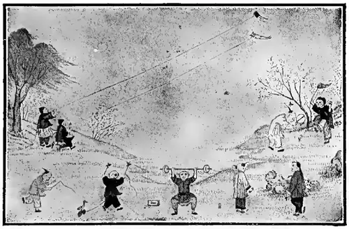 Another toy which foreigners call a top is entirely different from anything we see in the West. The Chinese call it a K'ung chung, while the top is called t'o lo. It is constructed of two pieces of bamboo, each of which is made like a top, and then joined by a carefully turned axle, each end being of equal weight, and looking not unlike the wheels of a cart. It is then spun by a string, which is