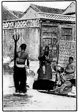 and a half feet long and an inch and a half thick, and, pitching it up into the air, caught it on his right arm as it came down. He allowed it to roll down his right arm, across his back, and along his left arm, and as he turned his body he kept the trident rolling around crossing his back and breast and giving it a new impetus with each arm. The trident had on it two cymbal-shaped iron plates which kept up a constant rattling.
