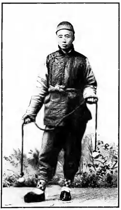 The old woman had small, bound feet. She lay flat on her back, stuck up her feet, and her husband put a crock a foot in diameter and a foot and a half deep upon them. She set it rolling on her feet until it whirled like a cylinder. She