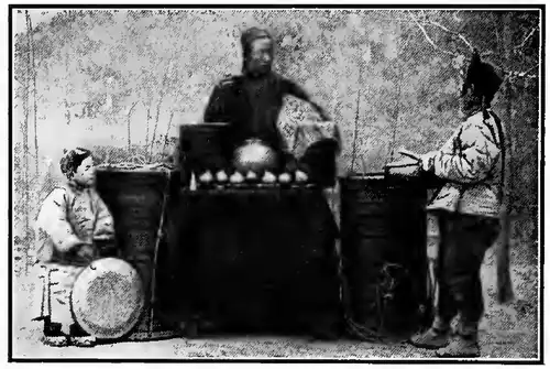He then changed the process. He tossed the bowl a foot high, and struck it with the other chop-stick one, two, three, four or five times before it came down, and this he did so rapidly and regularly as to make it sound almost like music. There is a record of one of the ancient poets who was able to play a tune with his bowl and chop-sticks after having finished his meal. He may have done it in this way.