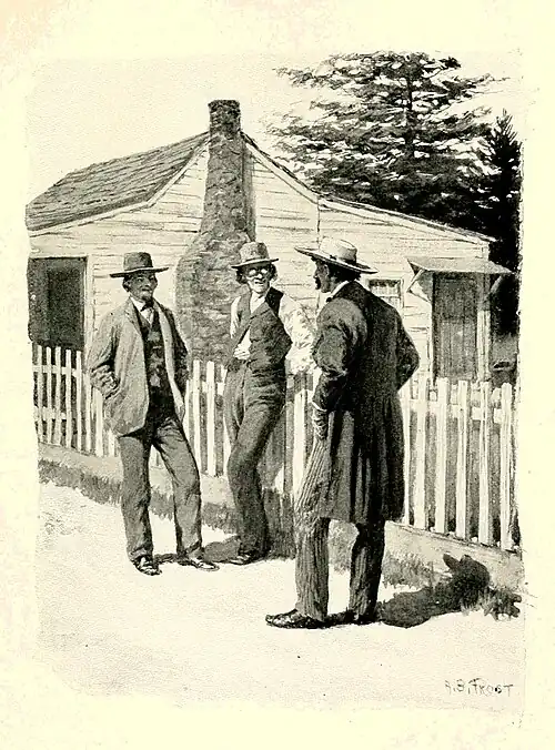 Behind one of these trees, near the outhouse in which Hamp and Aunt Minervy lived, I was to take my stand, while the Major and the Colonel were to go farther into the wood-lot so as to greet the would-be Ku-Klux as they made their retreat, of which Major Perdue had not the slightest doubt.