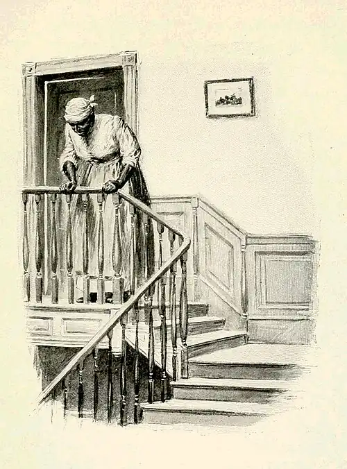 "I 'low'd 'twuz you," she said, "an' I'm mighty glad you come." She started to pour the water from can to pitcher, when suddenly she stayed her hand. With the exclamation, "Well, ef dis don't bang my time!" she went to the head of the stairs and cried out: "Miss Vallie! Miss Vallie! you don't want no town folks stuck in dish yer back room, does you?"