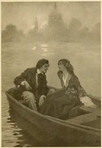 She was seated just in front of him on the left, with her hand idly rippling the surface of the silvery waters, gazing at the wooded cliff on the river banks clothed now in their gorgeous robes of yellow, purple, scarlet, and gold.