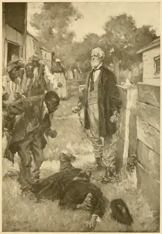 Receiving no answer, he roughly drew the doctor to his feet, held him by the arm, and led him thus in half-unconscious stupor through the principal street, followed by a drove of negroes. He ordered a squad of troops to meet him at the depot. Not a white man appeared on the streets. When one saw the sight and heard the clank of those chains, there was a sudden tightening of the lip, a clinched fist, and an averted face.