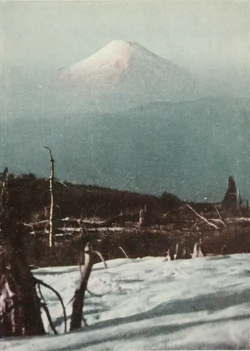 - ↑ The older Indians tell us their fathers saw these mountains smoking, and some declare that fire and rocks were thrown into the very heaven. They knew St. Helens as "Lowela-clow," meaning "Big Smoke Daytime—Big Fire Night." Fremont and others also saw St. Helens smoking and report that ashes from this mountain fell in the streets of The Dalles to the depth of half an inch in 1842. Dr. Parrish saw it active on the 23d day of November, 1842. Kane saw it smoking and made a sketch of it March 26, 1847. Winthrop noticed the black spot in the snow on the southwest side of St. Helens (this being the location of the last crater). He said in 1853, "sometimes she showers her realms with a boon of hot ashes to notify them that her peace is repose not stupor; and sometimes lifts a beacon of tremulous flame by night from her summit."