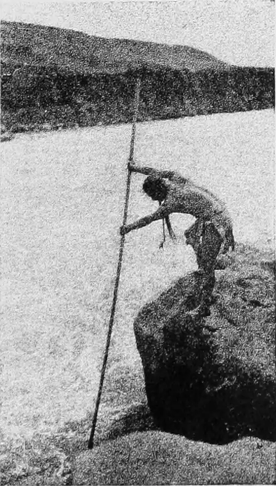 Today remnants of these Indian bands continue to come from different sections of the country, just as their fathers did. They stand on the jagged rocks in the rapids and spear the salmon coming up, or dip them out with nets. Many of the fish leap high out of the water below the falls in attempting the ascent of this great river.