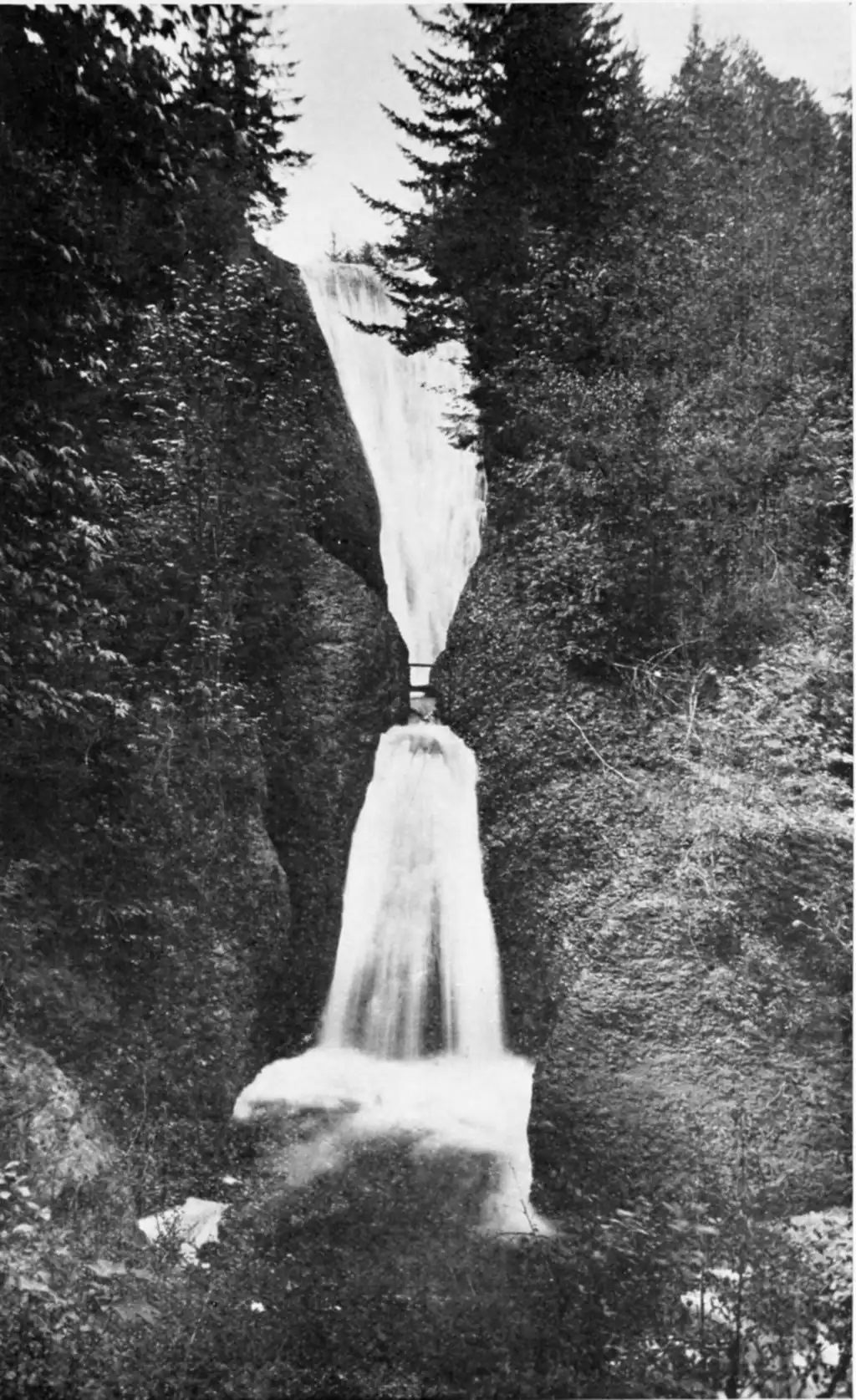 Wahkeena means "most beautiful" in the Indian tongue. Of all the water falls seen from the great Highway none is more beautiful. Mr. S. Benson purchased more than three humlrcd acres, embracing Wahkeena Falls and gave it to the public for a