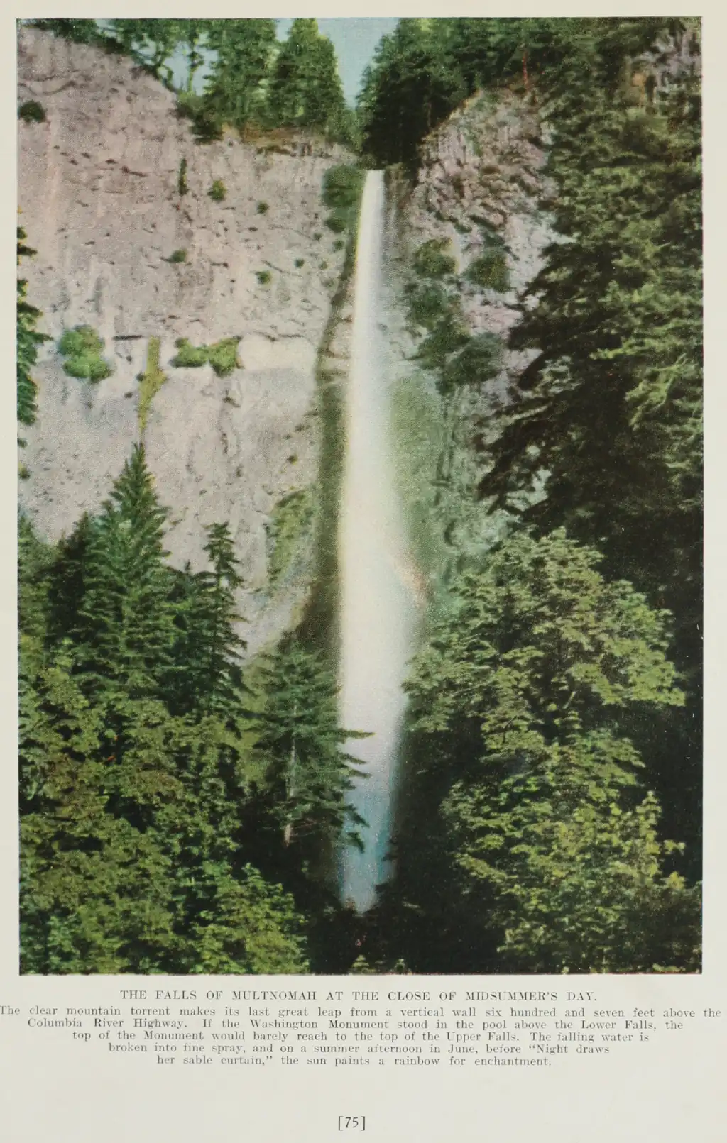 THE FALLS OF Mri/r(il.ll AT THE CLOSE OF MIDSUMMER'S J)AV. The clear niountfiin torrent makes its last great leap from a vertical wall six hundred and seven feet above the Columbia River Hig'hway. If the Washington Monument stood in the pool above the Lower Falls, the top of the Monument would barely reach to the top of the Upper Falls. The fallini;- water is broken into fine spray, and on a summer afternoon in June, before "Night draws her sable curtain," the sun paints a rainbow for enchantment.