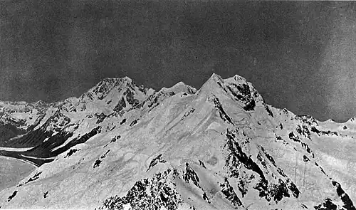 After a scrappy breakfast at 1.20 on the morning of the 23rd, we set out at 2 a.m. There was no moon, and we stumbled painfully over the lateral moraine by the light of a lantern, and then across the Tasman Glacier until we reached the point at the base of Mount De la Bêche. Here we scrambled up some scree and snow slopes for a few hundred feet, and then made a traverse across to the opposite side, facing the Rudolf Glacier.